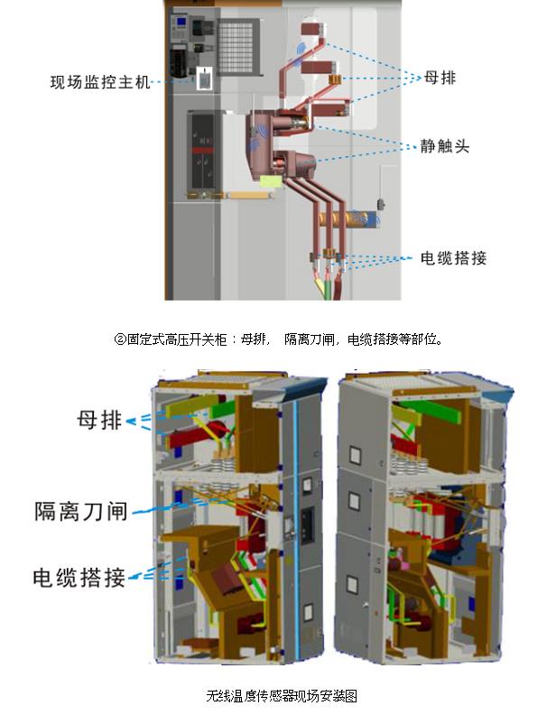 1、無線溫度傳感安裝于開關(guān)柜內(nèi)電纜頭、斷路器觸頭等電氣連接處等部位。